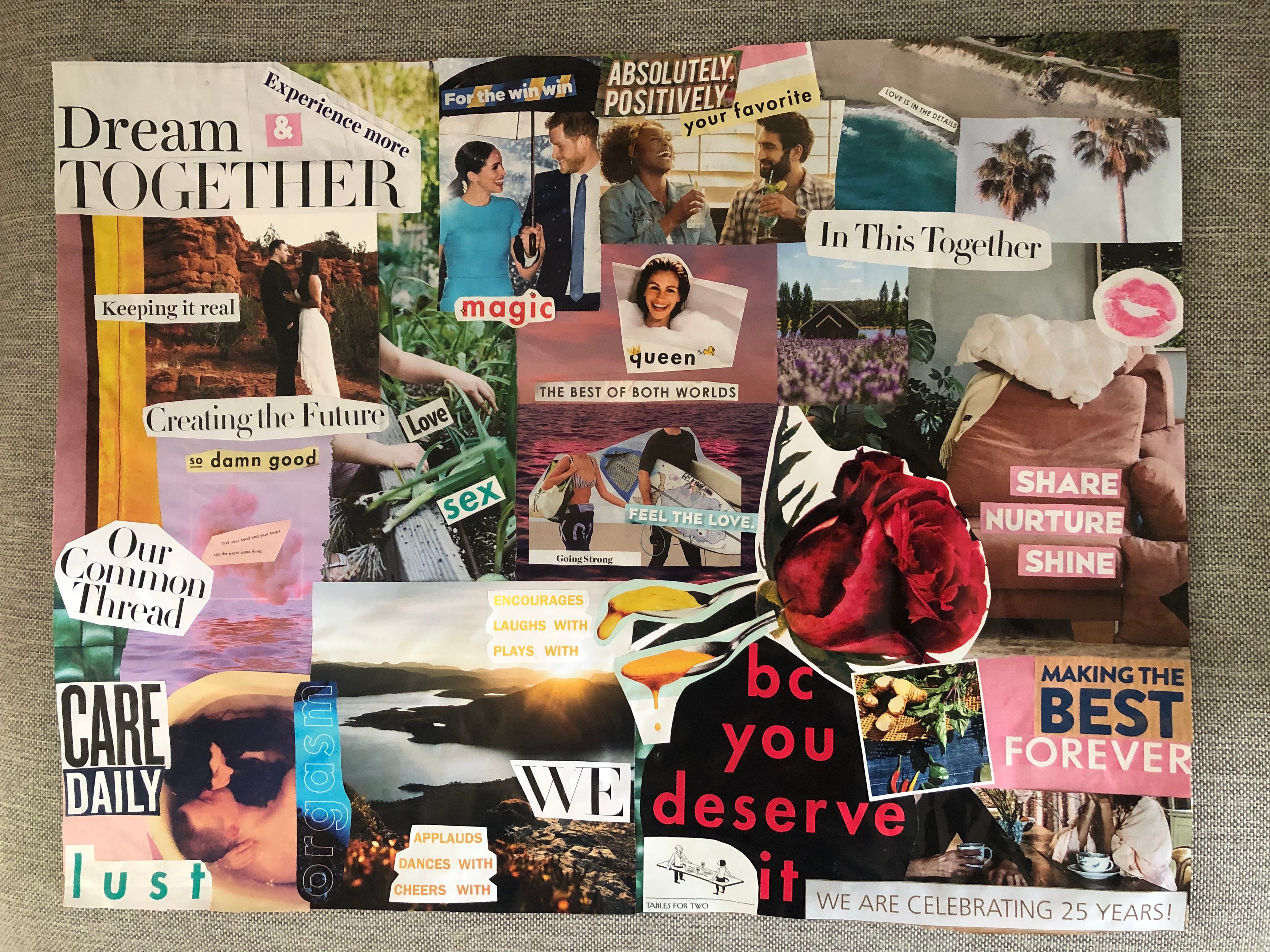 When it came time to commit the collage to Mod Podge, I wanted to imbue the glueing process with as much love and intention as possible. So, I made a playlist of songs that I felt communicated the type of relationship I was trying to manifest—an auditory vision board, if you will.